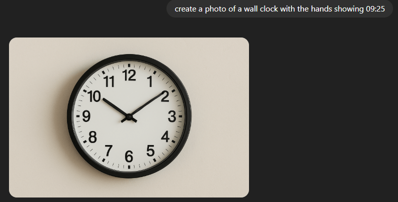 Then there’s the clock – I asked my grandson to pick a time at random – 09:25. And what did ChatGPT come up with? Predictably 10:10. It seems that most clock marketing photos out there show 10:10 because it’s symmetrical – and probably because everyone is copying those who came before them.