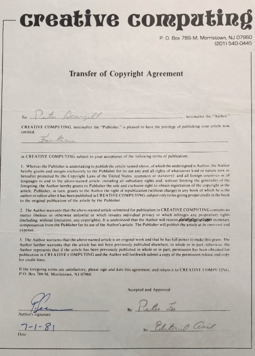All the issues of Creative Computing are, as it turns out, available on archive.org. But I’ve searched through every issue from 1981 (and from 1982 and late 1980 as well, just in case) and can’t find the article anywhere—nor anything else with your byline. (You are mentioned in the June 1980 issue, but only for submitting a correction to code that had appeared in an earlier issue.) Do you by chance know what issue it appeared in? Or do you know for sure it did appear; is it possible that after paying you for it and having you sign the contract Creative Computing for some reason never actually ran the article? Or might they have run it somewhere else than in their flagship magazine? (I did try to look for other publications by the company around that time, but couldn’t find anything relevant. Or perhaps there was a special issue of the magazine during that time that isn’t included in the archive.org collection?)