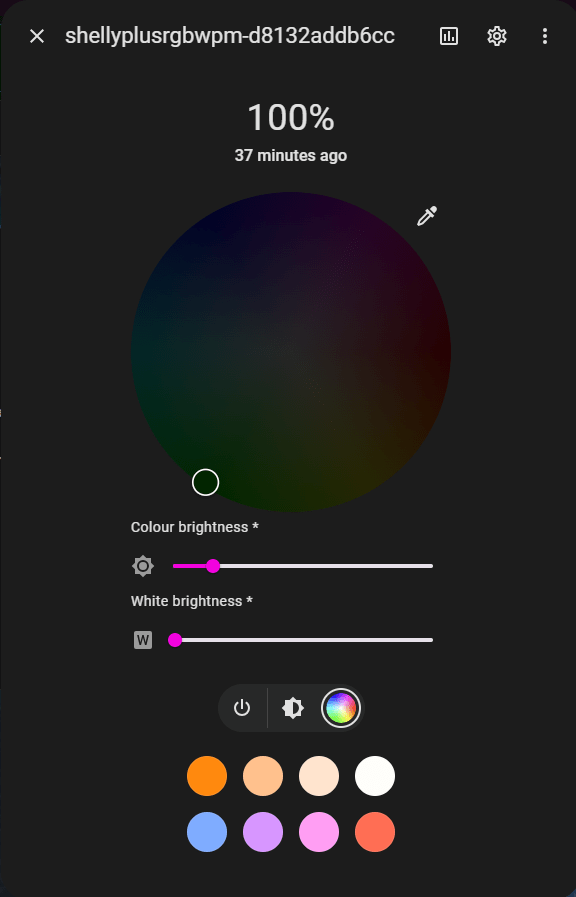 Ok, so here’s the tile in HA with the RGB device – all I had to do was give it a fixed IP (I also turned on MQTT – not sure if that was essential – but I’m used to doing that for Tasmota)… you can hardly see the colour wheel here as I turned the brightness down – seems daft but there you go.