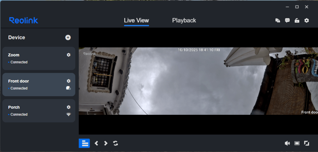 For now, the camera remains upside down outside on a bench – it’s getting dark and it’s quite cool – so perhaps that needs covering – dead easy to make impressive camera claims on a hot summer’s day – let’s see what it gets on a cloudy autumn evening.. Below is the PC Reolink app which took only a minute to set up including another two of my cameras. You can of course watch one camera or all of them.