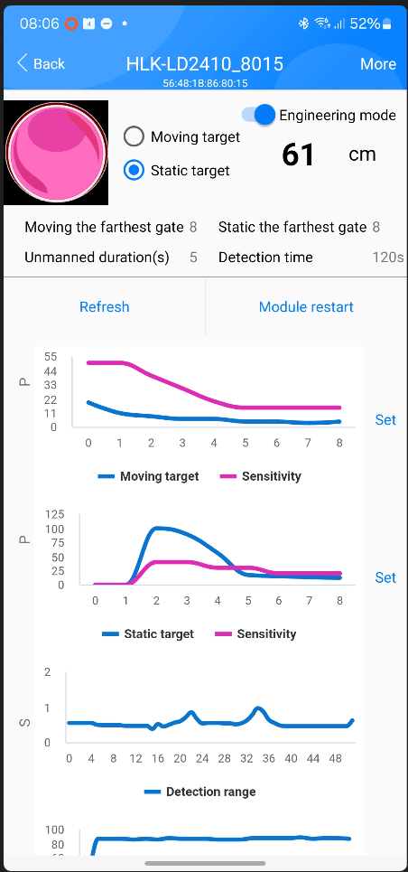 A couple of things – I’m still not sure I understand the radar well enough to comment on the MTR-1 and MSR-2 but there is someone who has gone into this – and from his write-up I discovered a free tool for Android/Apple called HLK Radar Tool – here’s a link to the article I read. And with both the modules in the same room as my phone – I get this output from the APP which is possibly Chinese as some of the text is a bit IFFY but the imagery is great – 2 images below from the 2 different devices..