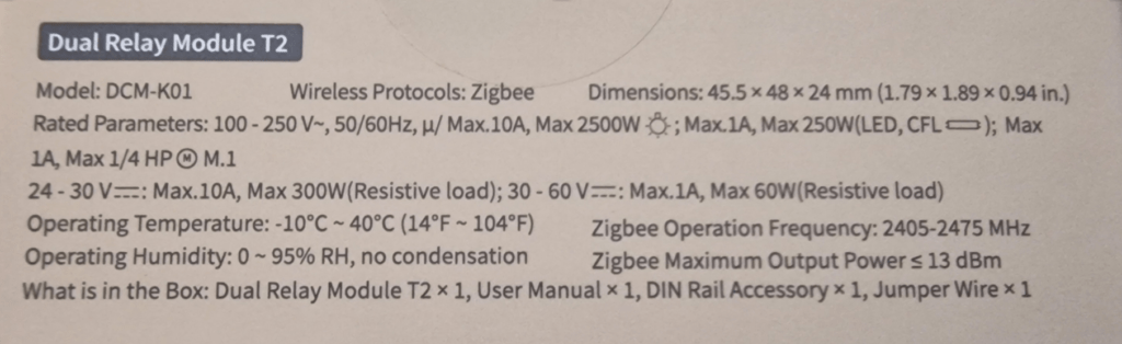 To the point – the Aqara T2 dual relay module is matter-compatible, is of course Zigbee and the relays handle max 10A at 240v (that’ll be 10A non-inductive) – but wait – a trip to the Aqara website reveals that the load is 10A MAX all in, NOT per-relay – that’s a bit odd. I’m looking at the spec right now on the box – see low voltage use and the sizes below… . Oh and you get a DIN rail bracket with it. Operating temperature sounds fine on the cold side but this summer, in the shade we had 42c+ the odd day in August so maybe indoor use then.