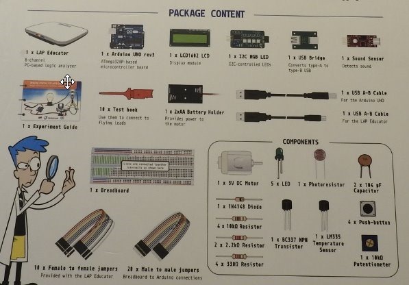 The ZeroPlus Kit is extremely well put together and comprises an Arduino Uno, an 8-channel logic analyser (I’ll use British spelling from now on), a breadboard and a host of peripherals including an LCD, an RGB LED, a USB bridge, sound sensor, test hooks battery holder, leads and several component.