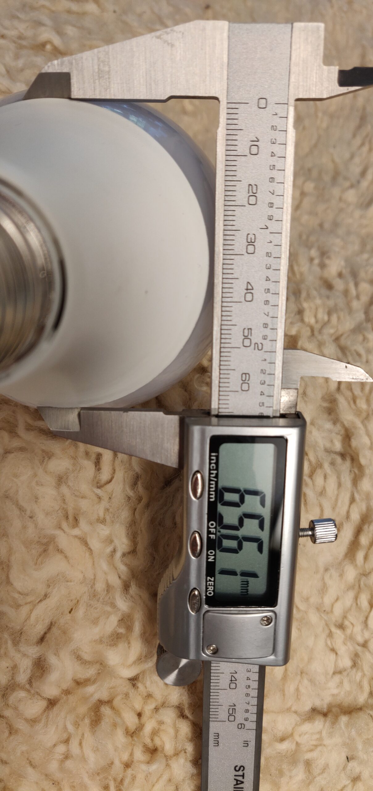 The maximum diameter of the “cone” immediately below the diffuser is 65.6 mm and the distance from the electrical contact tip of the E27 screw to the top of the cone is 85mm. These are pretty accurate using an electronic micrometer and naked eye! I couldn’t hold the bulb, micrometer and camera to take the 85mm measurement!
