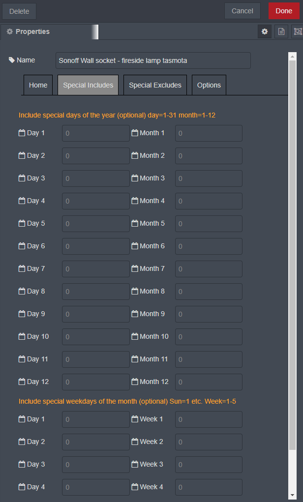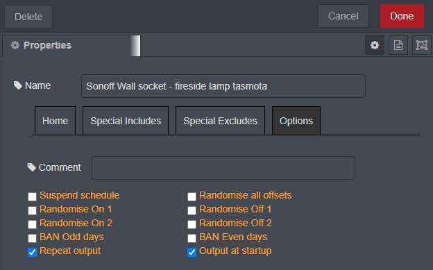You can tick a box to have output on power-up or not, you can tick a box to have the node auto-repeat the message every minute or not. You can add positive and negative offsets to the times (including dusk and dawn etc.), you can optionally add your OWN offset to the UTC time of the host computer and you even select a random value within the limits of the offsets (security lighting etc.) You can temporarily suspend the schedule via a tick box or a message.