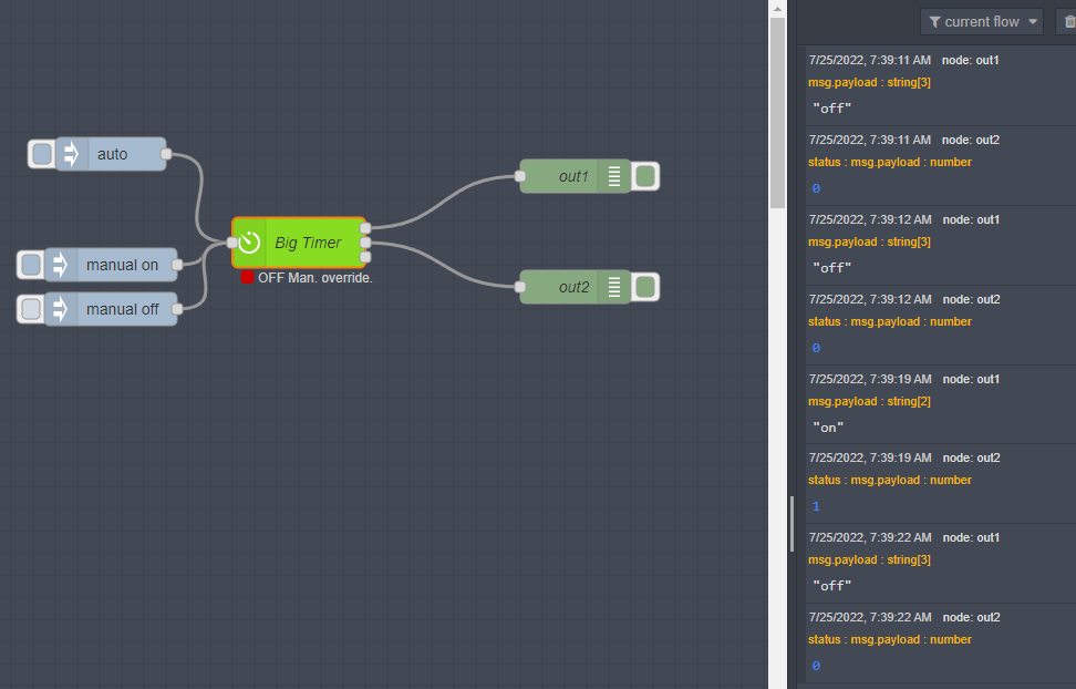 It’s fed by 4 injectors, the first calls the function every minute, without a payload, just so it will check the time and override states, and send mqtt as directed. The other three injectors are default, on and off like your bigtimer. on/off set override, default clears the override