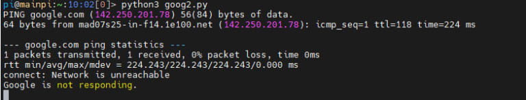 python3 goog2.py Error: PING google.com (142.250.200.110) 56(84) bytes of data. --- google.com ping statistics --- 4 packets transmitted, 0 received, 100% packet loss, time 139ms
