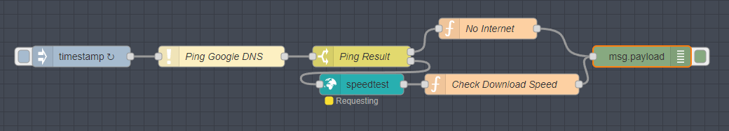 [{"id":"69cf1915.55fe18","type":"inject","z":"b48ff32d.9757d8","name":"","props":[{"p":"payload"},{"p":"topic","vt":"str"}],"repeat":"300","crontab":"","once":true,"onceDelay":0.1,"topic":"","payload":"","payloadType":"date","x":130,"y":140,"wires":[["21d9c670.7b0a38"]]},{"id":"21d9c670.7b0a38","type":"ping","z":"b48ff32d.9757d8","mode":"timed","name":"Ping Google DNS","host":"8.8.8.8","timer":"10","inputs":1,"x":330,"y":140,"wires":[["95d10ac0.f2c56"]]},{"id":"95d10ac0.f2c56","type":"switch","z":"b48ff32d.9757d8","name":"Ping Result","property":"payload","propertyType":"msg","rules":[{"t":"lte","v":"0","vt":"str"},{"t":"else"}],"checkall":"true","repair":false,"outputs":2,"x":530,"y":140,"wires":[["a5d2a31a.79c8c8"],["d344b313.27fc6"]]},{"id":"a5d2a31a.79c8c8","type":"function","z":"b48ff32d.9757d8","name":"No Internet","func":"msg.payload = \"No Internet or slow connection\";\nreturn msg;","outputs":1,"noerr":0,"initialize":"","finalize":"","x":710,"y":100,"wires":[["ba50e9c8.5ac53"]]},{"id":"d344b313.27fc6","type":"speedtest","z":"b48ff32d.9757d8","x":530,"y":180,"wires":[["e46a50e1.3cf68"]]},{"id":"e46a50e1.3cf68","type":"function","z":"b48ff32d.9757d8","name":"Check Download Speed","func":"const downloadSpeed = msg.payload.download || 0;\n\nif (downloadSpeed < 40) {\n msg.payload = \"Download speed is under 40 Mbps\";\n} else {\n msg = null; // No issue with speed\n}\n\nreturn msg;","outputs":1,"noerr":0,"initialize":"","finalize":"","x":730,"y":180,"wires":[["ba50e9c8.5ac53"]]},{"id":"ba50e9c8.5ac53","type":"debug","z":"b48ff32d.9757d8","name":"","active":true,"tosidebar":true,"console":false,"tostatus":false,"complete":"true","targetType":"full","statusVal":"","statusType":"auto","x":910,"y":140,"wires":[]}]