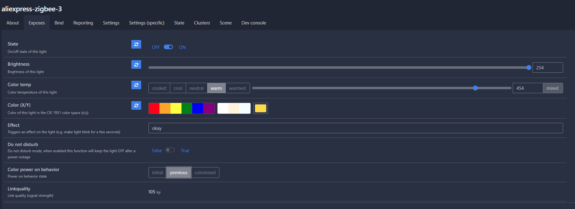 The function node simply converts from my other lamps into a suitable format to either select full on warm white OR an RGB colour #XXXXXX (I’m not a fan of cold white). The 3 node-red-contrib-zigbee2mqtt nodes are set to control STATE, COLOR and COLOR TEMPERATURE.