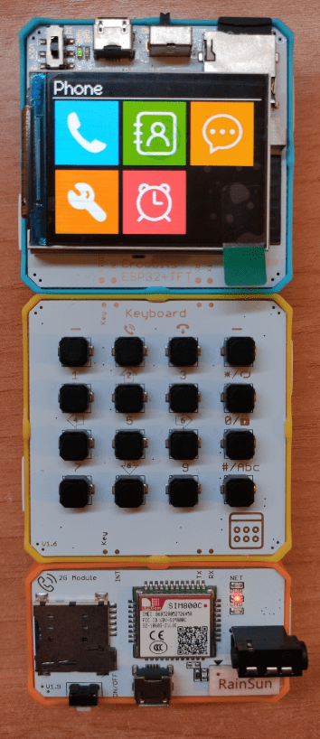 WELL, it gets easier by the minute – I didn’t even have to download anything or connect to a PC. I pushed the 3 magnetically-attached modules together (at which point the ESP32 display lit up to tell me there was no SD card plugged in), plugged the supplied uSD card into theinternal-battery-powered ESP32 module (see top-right of ESP32 module), pressed the ON button (top middle of the ESP32 module) and the ON/OFF toggle (bottom of the 2G module) and the next thing I knew (with no external supply – NOTHING) – I had a colour (none-touch) menu up as you might expect on a bottom-end PHONE. It seems the only thing I can’t do without a SIM is actually make a call. See photo on the left. Time spent to get this far – less than an hour including writing this blog entry (so far).