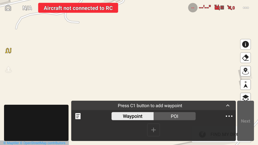 Below you’ll see an actual screenshot and I’ve expanded the map to full screen merely by clicking on it, leaving in the bottom left what will be the live drone video when one is connected. Clicking on that dark rectangle will restore the view to normal.