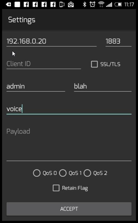 Select the MQTT plugin which just appears by magic (assuming you installed it). Fill in you MQTT details – you need address and port, user and pass (if you have a user and pass of course – some don’t but then I would not be using this out of the house if you don’t) and I used the TOPIC “voice”. The payload is