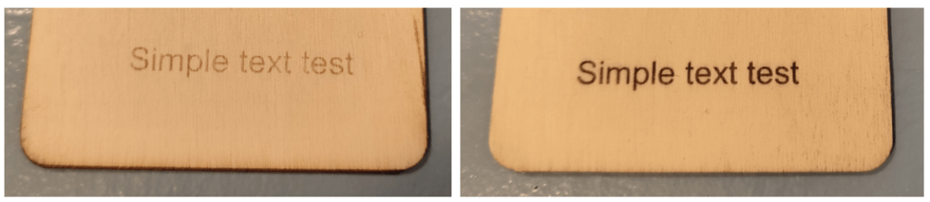 I dropped some simple text onto the work area using layer 0 (it’s a bit like using Corel Draw, really but more dangerous 🙂 ), clicked the properties of the layer and set the burn % to 100% and speed to 6000mm/minute. You see the result below (first engraving). Clearly it worked first time – that’s the simplest setup I’ve had for an engraver to date – but a slower speed and/or maybe using the higher power laser would be good. Still, better to start off lightly than put a hole in the bench. I learned that the hard way in my spanish office… there’s a nice, deep black mark permanently engraved in the bench over there. And yes, I did use the supplied green goggles.