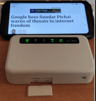 Well, THAT was easy. The NEXT step is to remove the WAN lead and plug in a known working SIM to see if I can get the phone to work again using only PULI WiFi. On the front edge of PULI is a cover, behind which are sockets for a SIM and a microSD. Off with the power, disconnect the WAN lead – done. Push in the SIM – done. Power ON. Wait – no sign of the 3G/4G light yet. Within 30 seconds, the PULI WiFi light is on. 30 seconds later, the 3G/4G light is on. Back to the BBC site on my Doogee phone – selecting a page I’ve never seen before again to ensure I’m not fooled by cacheing….