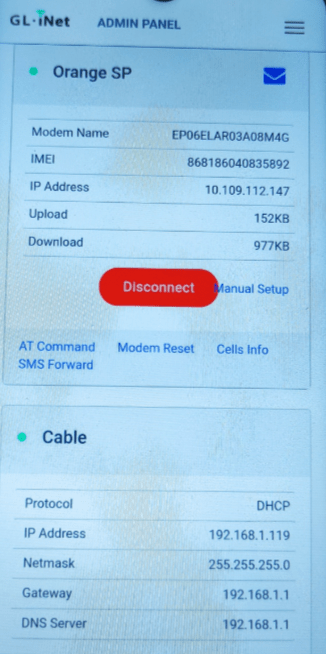 While waiting to hear from GL-iNET, I plugged my normal network back into the WAN port and on the phone I could see there were now 2 sources of Internet – the WAN and the 4G dongle.