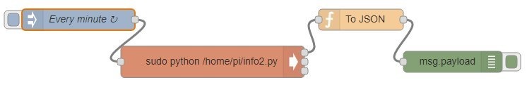 [{“id”:”1c9d19c9.8a913e”,”type”:”exec”,”z”:”d8b4747f.73fb58″,”command”:”cat /sys/class/thermal/thermal_zone0/temp”,”addpay”:false,”append”:””,”useSpawn”:””,”timer”:””,”name”:”CPU Temp.”,”x”:432,”y”:106,”wires”:[[“cf6d0532.df47d8”],[],[]]},{“id”:”567c9074.b5128″,”type”:”inject”,”z”:”d8b4747f.73fb58″,”name”:”10 seconds”,”topic”:””,”payload”:””,”payloadType”:”date”,”repeat”:”10″,”crontab”:””,”once”:false,”x”:209.5,”y”:183.25,”wires”:[[“1c9d19c9.8a913e”,”d283ed48.5dc4″,”78aea6f8.1cd8″]]},{“id”:”d283ed48.5dc4″,”type”:”exec”,”z”:”d8b4747f.73fb58″,”command”:”top -d 0.5 -b -n2 | grep \”Cpu(s)\”|tail -n 1 | awk ‘{print $2 + $4}'”,”addpay”:false,”append”:””,”useSpawn”:””,”timer”:””,”name”:”CPU Load”,”x”:432,”y”:186,”wires”:[[“2be28cc6.2b667c”],[],[]]},{“id”:”78aea6f8.1cd8″,”type”:”exec”,”z”:”d8b4747f.73fb58″,”command”:”free | grep Mem | awk ‘{print 100*($4+$6+$7)/$2}'”,”addpay”:false,”append”:””,”useSpawn”:””,”timer”:””,”name”:”Free Memory”,”x”:432,”y”:266,”wires”:[[“2572d691.7c055a”],[],[]]},{“id”:”d08bcea3.6c4ef”,”type”:”exec”,”z”:”d8b4747f.73fb58″,”command”:”df -h”,”addpay”:false,”append”:””,”useSpawn”:””,”timer”:””,”name”:”Disk Usage”,”x”:432,”y”:346,”wires”:[[“dc5bcdc5.fedcc8”],[],[]]},{“id”:”dc5bcdc5.fedcc8″,”type”:”function”,”z”:”d8b4747f.73fb58″,”name”:”extract data”,”func”:”var re = /([0-9]{2})%/\nvar idx = msg.payload.search(re);\nvar str = msg.payload;\nif (idx >=0) {\n str = msg.payload.substring(idx, idx + 2);\n}\nmsg.payload = str;\nreturn msg;”,”outputs”:1,”noerr”:0,”x”:632,”y”:346,”wires”:[[“bc5a1426.0e5b58”]]},{“id”:”c0a69251.44a42″,”type”:”inject”,”z”:”d8b4747f.73fb58″,”name”:”1 minute”,”topic”:””,”payload”:””,”payloadType”:”date”,”repeat”:”60″,”crontab”:””,”once”:false,”x”:222,”y”:346,”wires”:[[“d08bcea3.6c4ef”]]},{“id”:”cf6d0532.df47d8″,”type”:”debug”,”z”:”d8b4747f.73fb58″,”name”:””,”active”:false,”console”:”false”,”complete”:”false”,”x”:847,”y”:97,”wires”:[]},{“id”:”6979f666.012968″,”type”:”debug”,”z”:”d8b4747f.73fb58″,”name”:””,”active”:true,”console”:”false”,”complete”:”false”,”x”:837,”y”:166,”wires”:[]},{“id”:”2be28cc6.2b667c”,”type”:”debug”,”z”:”d8b4747f.73fb58″,”name”:””,”active”:true,”console”:”false”,”complete”:”false”,”x”:837,”y”:166,”wires”:[]},{“id”:”b889c277.c74d68″,”type”:”debug”,”z”:”d8b4747f.73fb58″,”name”:””,”active”:true,”console”:”false”,”complete”:”false”,”x”:839,”y”:249,”wires”:[]},{“id”:”2572d691.7c055a”,”type”:”debug”,”z”:”d8b4747f.73fb58″,”name”:””,”active”:false,”console”:”false”,”complete”:”false”,”x”:839,”y”:249,”wires”:[]},{“id”:”bc5a1426.0e5b58″,”type”:”debug”,”z”:”d8b4747f.73fb58″,”name”:””,”active”:false,”console”:”false”,”complete”:”false”,”x”:833,”y”:344,”wires”:[]}]