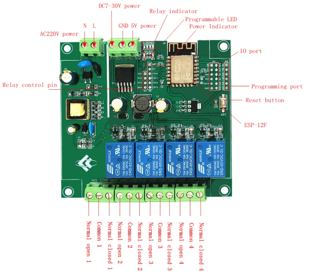 This board however goes a stage further and offers not only 220vAC input, but also 7-30v DC and 5V input. It has 4 10A relays and connectors for spare GPIO and FTDI – which makes programming it up for Tasmota a snap. So, kind of like the Sonoff 4CH Pro but cheaper and more flexible but uncased.