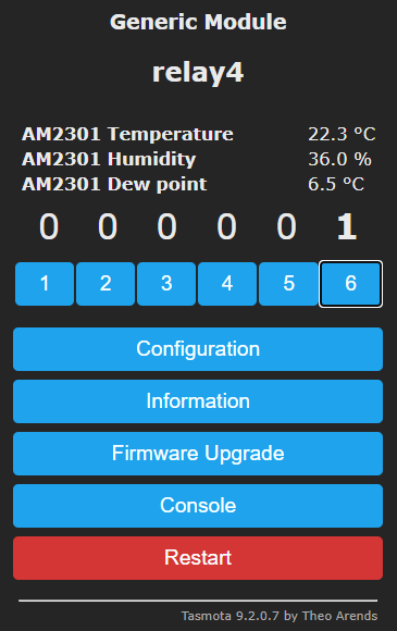 Who says the ESP8266 doesn’t have enough pins. So, in the image above, toggles 1 to 4 control the relays – toggle 5 (power 5) turns the internal LED on and off and toggle 6 turns the SSD1306 display on and off.