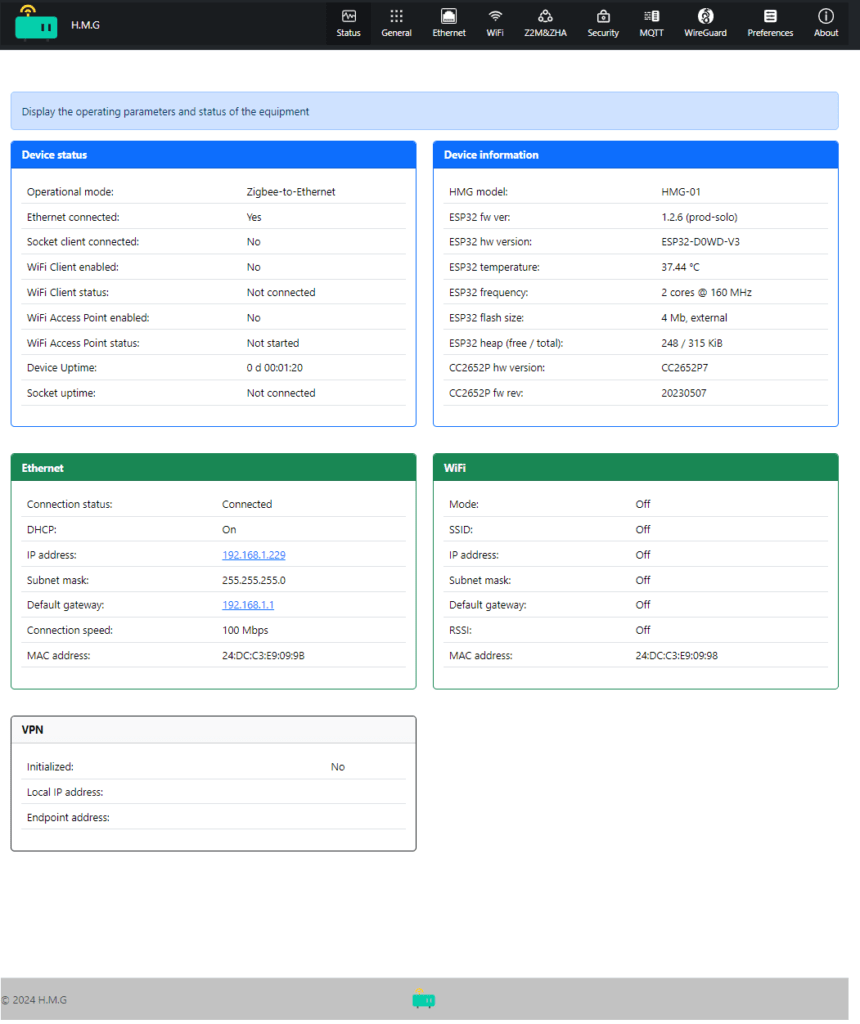 Ethernet can be DHCP IP or you can fix the IP in the menu. Same with WiFi. You can also enable or disable MQTT with or without security. The unit also optionally turns Wireguard VPN on. Under system tools, you can check logs and see that HamGeek uses the CC2652P7 Zigbee chip.