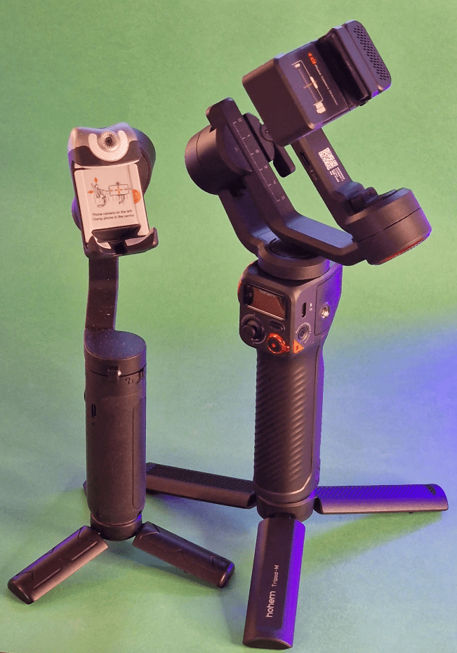 This is NOT a pocket gimbal – as is obvious by comparison with the earlier V2 from Hohem – though it would fit into a large coat pocket. It does fold up well and just FEELS substancial and really doesn’t seem to care about getting the phone finely balanced. (The plate on my phone is for car-mounting, nothing to do with the gimbal).