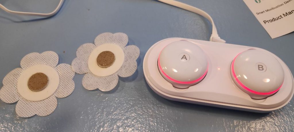 In short, two round heating units on which you fix replaceable adhesive pads (moxa patches) so you can stick the two units on your arms, back etc at the “correct acupoints” . You can press the button on each unit once, twice for gentle heat or three times for “hot heat”. Once I got of the floor laughing I decided to give the units a go (after USB charging of course).