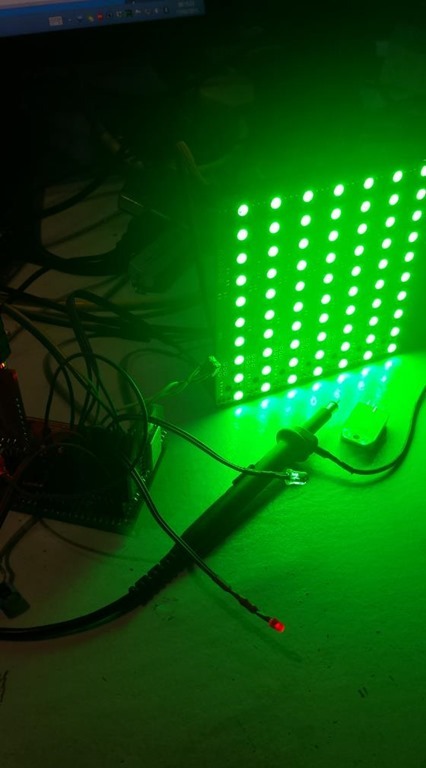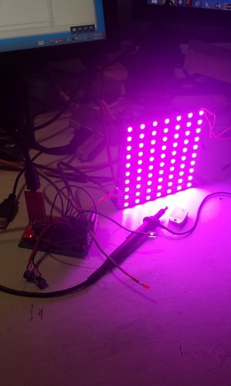 Quick test of the new ESP8266 code for driving the ws2812b LEDs… not far off 2 amps at 5v in at one end – GND and ESP8266 signal other end… fully tested with 300 serial LEDS – this is my next WIFI SAD LIGHT once I find something with enough power and some very thick cable. 70 LEDs here.