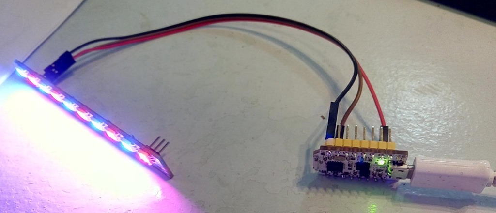 I plugged a (short) length of WS2812b strip (a custom board we had made) into the ESP-210, fired the instruction and… worked first time out of the box. Impressive.