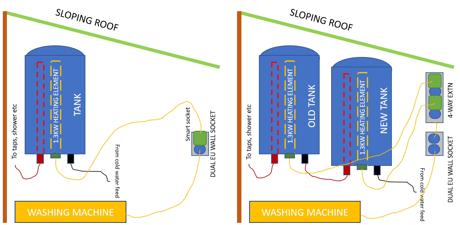 There is no way I can fit the two Meross units side by side using my 2-way Spanish power wall outlet due to the sheer size of the Meross units (most smartplugs have the same issue). So, against my better judgement, I’ll have to put them on an extension… BUT having tested each tank with the Meross units and now knowing the tanks only take 1.3KW – and knowing that Spanish cheapest rate electricity runs from midnight until 8am (and all weekend), I believe I can safely run these two on an extension, giving say, the first tank two hours at midnight, then the second tank 2 hours at 2am, back to #1 at 4am, #2 at 6am (and leaving power to the second tank off when I’m home alone).
