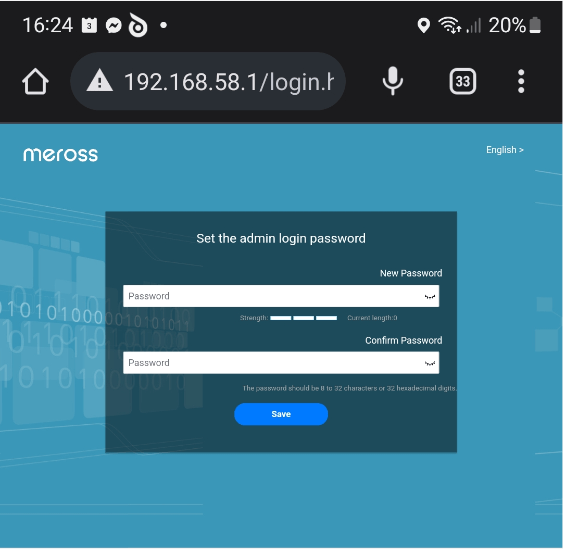My phone SHOULD have seen two Meross access points – a 2.4G and a 5G access point. In fact it saw MERROS_MW_4629 only but that’s due to the combining function in my phone. I connected no problem. I then pointed the phone browser to 192.168.58.1 as instructed. On the top right I noted a language selector – default was German – this was easily switched to English.