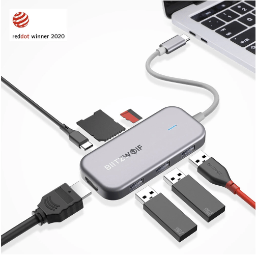 The Blitzwolf 7-in-1 hub has a distinctive look to it – and has a standard HDMI video connector as well – I LIKE IT – so – I can now also have an external monitor on my new tablet. This photo below pretty much says it all but my tablet has only ONE USB C port so this is really quite relevant to me.