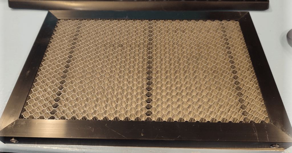 I only just finished updating my Aufero Laser 1 article – and yesterday, from Banggood, my new mesh base arrived, assembled. Inclused in the pack is a full size aluminium plate and 6 adhesive pads. No documentation so I had to make guesses, I cut the pads in half, I used half to stick the aluminium to the bottom of the mesh and the others to stop the whole lot sliding around on my bench. I’ve since hear from Banggood who say the pads were intended for fixing between the honeycomb and the aluminium – but I’m happy with what I’ve done.