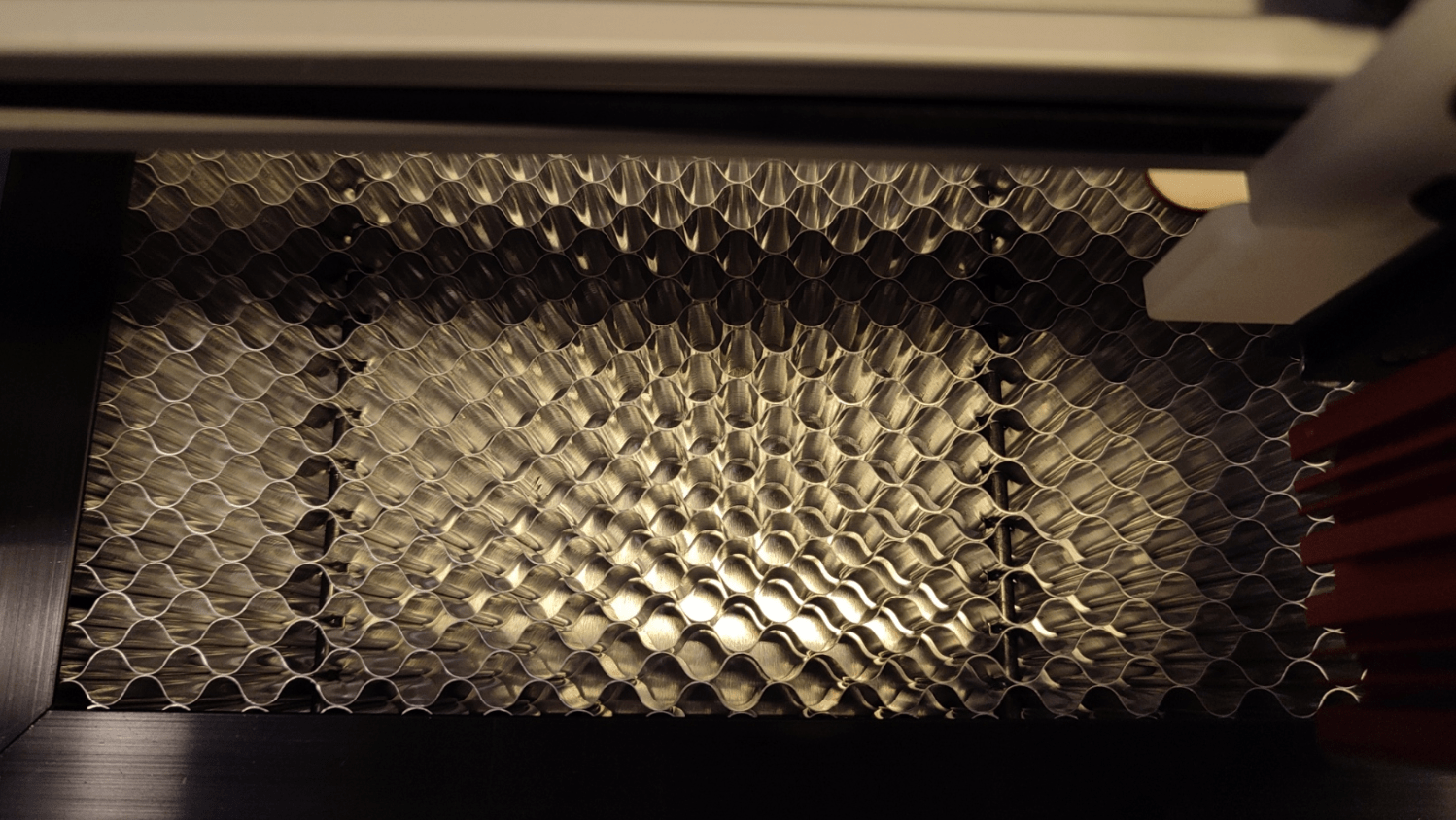 I’ve a 30W (input) laser in here and it can do a lot of damage to a bench. I checked it at full power running through that mesh. No significant heat, no marking – looks like new.