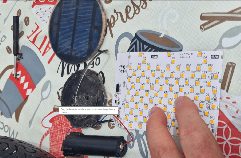 As you can see in the image above, I’ve opened this one up and carefully unsoldered the flexible PCB containing 96 LEDs,the circuit and showing the (in this case) standard 18650 battery and solar panel. I checked the battery – 4.2v – which means it has been sitting outside charging every day. I removed the on-off switch ages ago (and shorted out the wires) – they’re always a source of problems (damp, thin wires)…