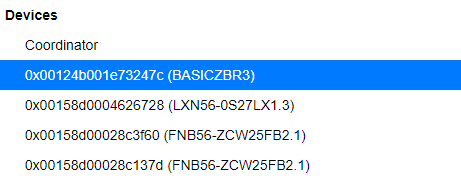 Note the devices by number information in the image below – not yet quite as friendly as Tasmota WiFi devices. You see the Sonoff socket followed by the Zemismart socket. The bottom two devices are lights and of course you can create friendly names for these devices.