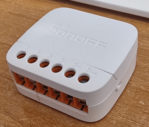 One use for the battery-powered SMATE is, well, let’s say you have the MiniR4 controlling a room light but you still want the original wall switch to do something. On the wall switch (assuming it’s not a changeover upstairs/downstairs arrangement) disconnect the two wires from the switch (common sense here, do this with the power turned off) and short using, say, chock-block so the light is totally controlled by the R4. Then put the S-MATE behind the now-disconnected wall-switch and connect, say, an S and S1 (see photos above) to the original switch contacts. With the right setup, not only can the R4 control the light by whatever means (the button or, say, MQTT or eWeLink control), but also the original switch remains functional.