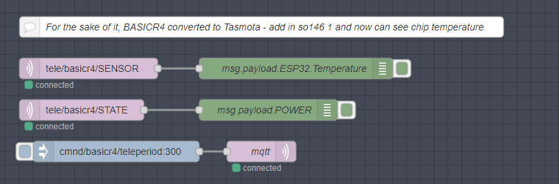 Finally, after Tasmotising the ESP32-based BASICR4, I happened to notice on the web that by invoking SETOPTION146 1 (or so146 1) I can – if I wish – see the ESP32 temperature. So, to demonstrate – from Node-Red in MQTT… I recently realised that setting the teleperiod (it is already at 300 seconds so no change) immediately invokes a TELE response – handy…. in the test below, MQTT just returned OFF and 66.8 (centigrade) – hardly room temperature – I must say, I fail to see why it is so warm with the load off.