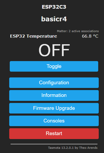 Both boards on their PCBs have gnd, serial in, serial out and 3v3 available for programming (with the mains input disconnected) and as the original BASIC unit was ESP8266-based and Sonoff used the pushbutton on the unit to turn the relay on and off, connected to GPIO0 – hence that could be held in on power-up to act as a programming pin so it was easy to program TASMOTA onto the board. The new R4 board is ESP32-based for no user-advantage that I can see other than that the ESP32-based device CAN talk to MATTER – whereas the older device cannot – as evidenced by lack of MATTER QRCode in the old hardware. Lets hope that doesn’t push the price up – as I write this, Tasmota and MATTER on Google HOME isn’t perfect.