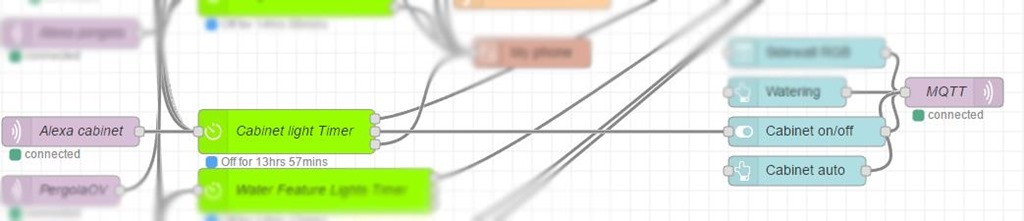 If you look at the first image you will see the middle output of the node feeds into the Node-Red Dashboard “Cabinet ON/OFF” control – this is to ensure that (once a minute) the dashboard on-off control actually reflects the state of the output whether on auto or manual override. The actual outputs of the control send 1 or 0 (or in the case of the blue button “auto” to MQTT – to the same topic – i.e. “alexa_cabinet”. Sadly Ha-Bridge is very restrictive in what you can actually do so it is not possible to say “Alexa set cabinet to auto”. This can be done by other means but they are currently a little messy.