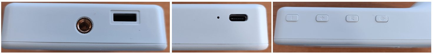 So on the underside, a tripod mounting bracket (there’s a wall mounting hole on the back, also as well as supplied double-sided tape). Left, a USB-C socket, right – 4 buttons including power, mode, up, down. The bottom of my unit has a quality control label, but when removed, nothing but a hole underneath, no connections for access control.