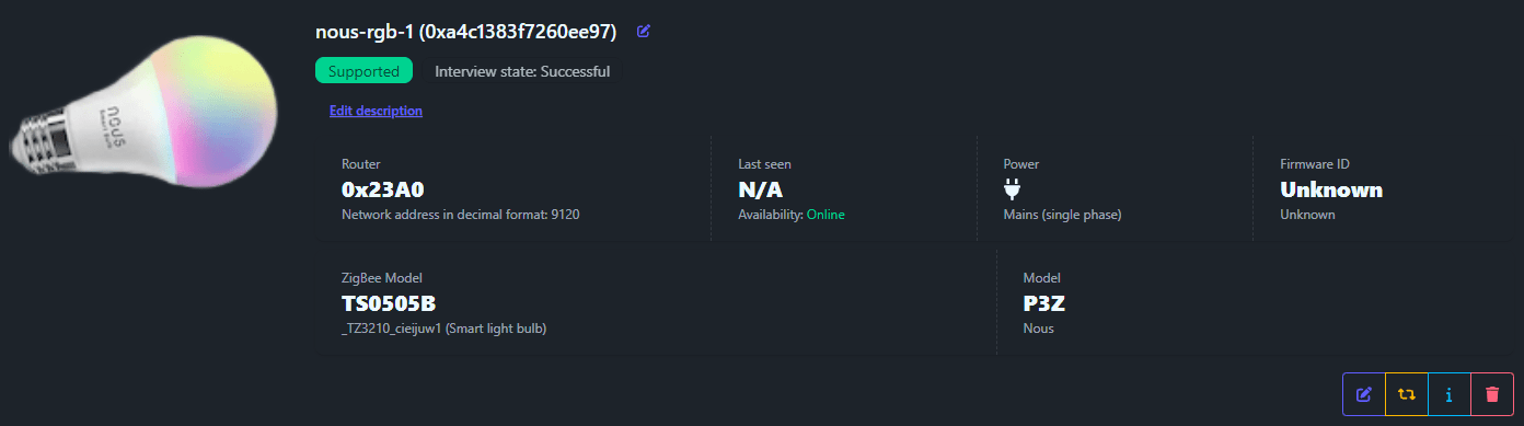 Ok, so deep dive into the new NOUS bulbs – these are Zigbee 3.0 – I pulled one out of the pack – plugged it in (the lights initaially flash for setup – nothing to do on the light itself) – set my Zigbee2MQTT to accept new devices and a new device with the usual long-winded numerical ID appeared. I ran the RENAME command in Zigbee2MQTT (which has a spiffy new interface in Home Assistant incidentally) and..