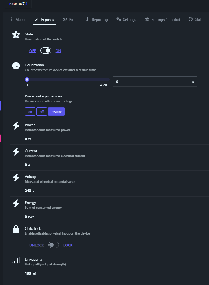 Anyway, I plugged it in to the mains. There was a blue light on the button, not flashing, so just instinctively I held the button in for several seconds. The blue light on the button started flashing on and off. I went to my ZigBee2MQTT panel and added the unit in, and that was it. Fully supported by Zigbee2MQTT (and of course by Nous’s own app if you’re that way inclined).