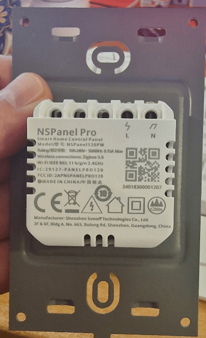 Haven’t I already written about the NSPANEL PRO? Yes I have here.. but this is slightly different, instead of the square form factor – this one is LONG. For the USA (why the USA, no idea, I’d have thought we in Europe would be just as keen – but what do I know). I received mine with the backing box (as against sticking the panel on the wall) – and the reason others have beaten me to it is that I put it to one side as I could not figure out how to get the panel into the backing box. At first sight there seem to be no mounting holes suitable for this panel as the holes in the box APPEAR to be on the sides, not top and bottom.