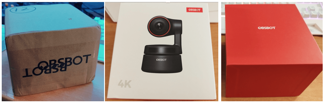 The outer packaging is a simple cardboard container marked Obsbot. Within that, the official box – white with red top and bottom – within that an all-red OBSBOT box – and within that, the carry/storage case – a lovely grey cloth-like material. Got to hand it to their marketing department – this catches the attention.