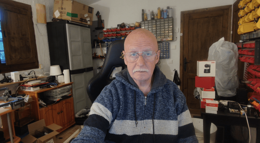 As it’s early in the morning I simply went off to put on some warm clothing (mid-April – Southern Spain – it’s supposed to be toasty warm – but not today – In my original blog on the Obsbot Tiny – the weather was much nicer – way too cold for that t-shirt right now) and as I came back into the office, the new Obsbot was tracking me effortlessly around the room – I’d not set ANYTHING UP, no proper lighting – nothing …. it just worked. The two shots above were implemented simply by sticking my hand in the air with my index finger up at which point the Obsbot smoothly zoomed in and out. I like this. As for head tracking, this next snap below is taken from a completely different angle – the camera just automatically moved around to follow me.