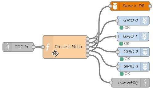 So this is a simple visually designed process in Node-Red. The TCP comes in – it is processed by a server-side JavaScript function in node-red – which then shoves out commands to the two ports (in the case of output, not status) – and replies to the TCP by using the original incoming message (so it knows where to send the reply).