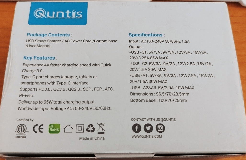 So what’s the difference between the Quntis RX-1919-5 Smart PD Charging Station (with IntelliSense whatever that is in this context) and dozens of other similar-looking chargers out there? Certainly there are many out there which look the same – but looks can be deceiving. To be sure, visually they blew the chance to light it up like a christmas tree as there is a single, subtle white LED on the front panel along with the USB-C1 65W, USB-C2 30W, USB-A QC3.0 30W outputs and a pair of USB-A 5V@2A outputs. But wait…