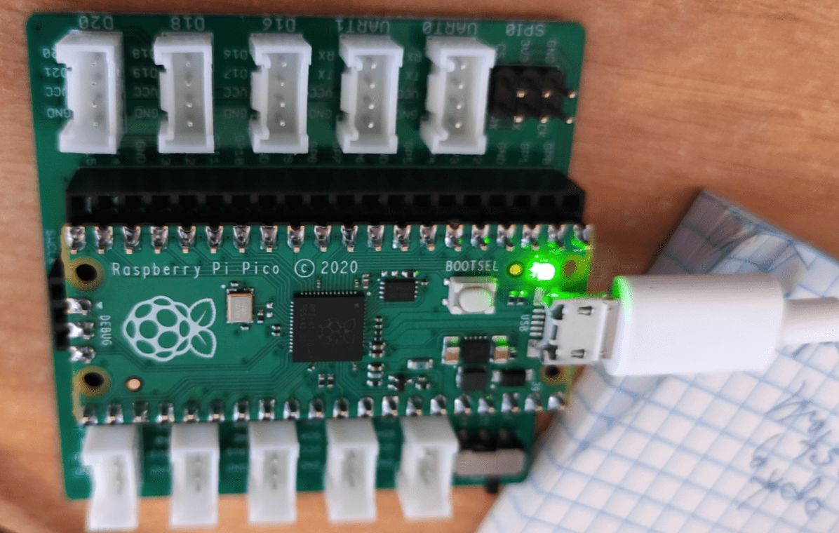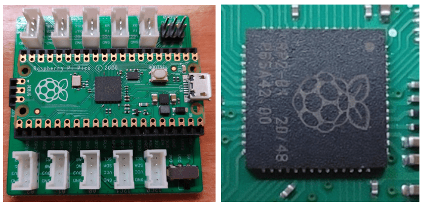 Photo below minus pins – granted the PICO and Grove shield WORK better when I actually put some pins in – see below video link as I just got a new soldering iron (August 2021).. but this LOOKS neat – and the “chip ID” IS on the top after all! Anyway I’m having a play with the PICO on that SEEED “baseboard” or shield – I also checked with another company but the cost of their baseboard plus postage (they insist on using DHL – WHY?) is beyond reason.