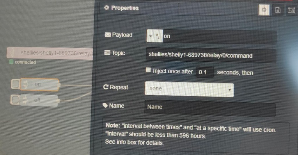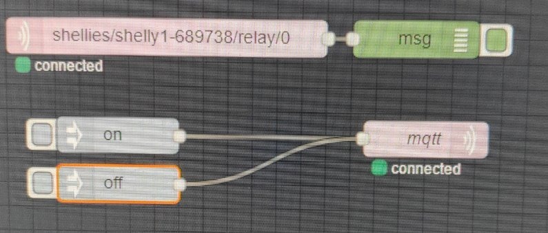 From that point on, I simply added 2 commands to my Raspberry Pi Node-Red screen – an “inject” node to turn the output of the Shelly ON” and another to turn it off. In the screen you will also see status monitoring – but that is just there for completeness.