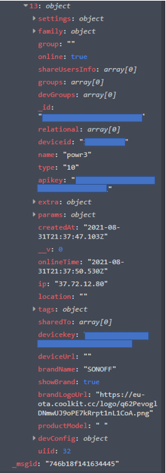 As you can see, in the output (JSON – easier than it may look) of object 14 (0-13) (I’ve erased details to protect the innocent) the only info I needed was the “deviceid” to go with my account credentials – that’s it.