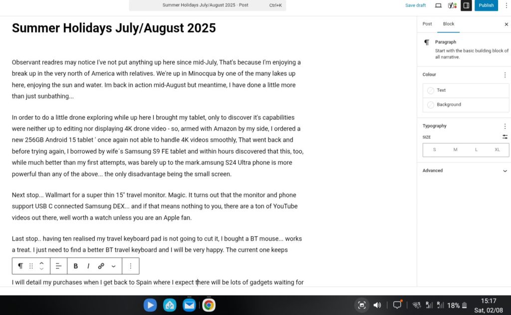 In order to do a little drone exploring while up here I brought my cheap Android 128GB tablet with me, only to discover it’s capabilities were neither up to editing nor even displaying 4K drone video – so, armed with Amazon by my side, I ordered a new 256GB ($250) Android 15 tablet. Disappointingly, once again this was not able to handle 4K videos smoothly so that tablet went back to Amazon – and before trying again, I borrowed by wife´s Samsung S9 FE tablet – and within hours discovered that this, too, while much better than my first attempts, was barely up to the mark. It turns out that my Samsung S24 Ultra phone is way more powerful than any of the above… the only disadvantage being the small screen and keyboard.